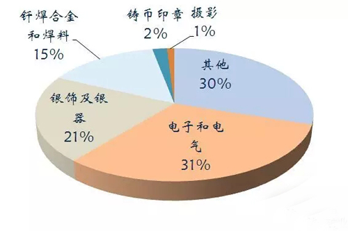 銀主要應(yīng)用于工業(yè)、醫(yī)學(xué)、首飾3個(gè)方面。我國銀的主要用于電子電器工業(yè)、焊接合金以及首飾加工等。2014年中國銀儲(chǔ)量4.3萬噸,產(chǎn)量4200噸。