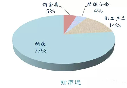 鋼鐵行業(yè)是鉬的主要消費(fèi)領(lǐng)域,其消費(fèi)量占中國鉬總消費(fèi)量的75%以上。2014年我國鉬儲(chǔ)量430萬噸,產(chǎn)量10萬噸。