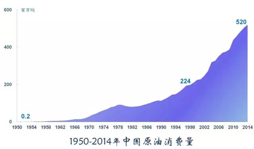 石油在中國一次性能源消費(fèi)中占比20%,僅次于煤炭,但是是有對(duì)國防安全具有重大的戰(zhàn)略意義,是必不可少的戰(zhàn)略資源。中國石油消費(fèi)與日俱增,從50年代的24萬噸激增至2014年的5.2億噸,是建國時(shí)的2600倍。